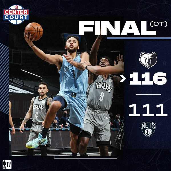 加时赛开始后,瓦兰丘纳斯扣篮得手,帮助灰熊队率先占得先机。之后,两队接连不中,随后,灰熊队接连出现失误,勒维尔趁机连砍5分,帮助篮网队反超比分。而后,两队陷入白热化的争夺,比分交错上升。到了比赛的最后时刻,灰熊队两罚一中,拥有2分的领先优势。随后,篮网队三分不中,之后,灰熊队接连罚球,直接打没悬念。最终,灰熊队以116-111战胜篮网队。