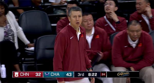 三节打完男篮落后18分,末节男篮落后的越来越大,王岚嵚的三分根本不够,杨瀚森摔倒失误以及三分打铁,朱俊龙也错失三分;比赛还剩4分17秒,黄蜂撤下主力,换上板凳末端的球员;杨瀚森双手暴扣却走步在先又失误,杨瀚森空切暴扣,之后强硬造犯规罚球得分,一番对阵,最终男篮又惨败输了,郭士强执教后男篮遭遇5连败。