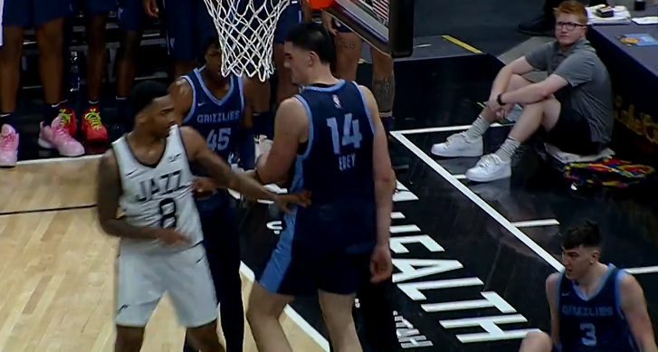 24直播网讯 北京时间7月9日,NBA夏季联赛加州经典赛,在灰熊爵士比赛中,场上爆发冲突,灰熊新秀扎克-伊迪为队友出头挑衅对手引冲突,爵士新星乔治指着伊迪狂喷垃圾话,双双吃到技术犯规。