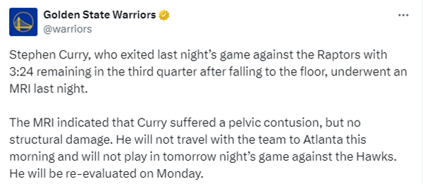 勇士官宣库里的核磁检查结果,官方声明:库里在昨晚对阵猛龙的比赛中受伤,第三节还剩3分24秒时倒地离场,昨晚接受了核磁共振检查,核磁检查结果显示,库里遭受了骨盆挫伤,但没有结构性损伤,他今天没有随队前往亚特兰大,也不会参加明天与老鹰的比赛,他将在周二接受复查。