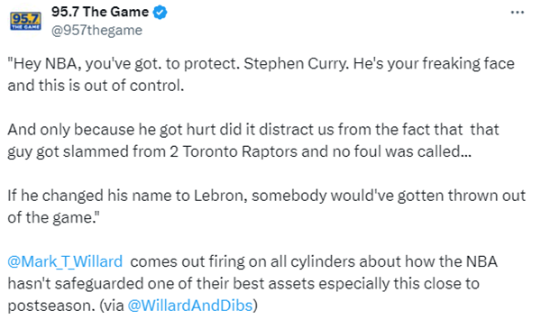 对于库里受伤一事,湾区电台名嘴Mark Willard表示:嘿,NBA,你们得保护斯蒂芬-库里,他是你们的招牌球星,而现在的情况已经失控了,如果不是因为他受伤,我们本该关注的是,他被两名多伦多猛龙球员狠狠撞倒,却连个犯规都没吹……如果他把名字改成勒布朗,早就有人被驱逐出场了。