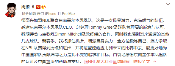 与此同时,周琦感谢东南墨尔本凤凰队的诚意与认可,期待与主教练Simon Mitchell及教练组的合作;也感谢发来邀请的其他几支球队;最后感谢中国篮协,能更好地为中国国家队贡献绵薄之力是我不变的追求和目标。