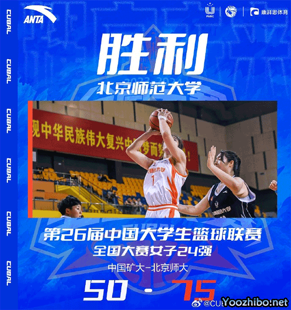 24直播网讯 6月11日讯 CUBAL全国大赛女子组,北京师大对阵中国矿大。一开场,北京师大率先发力,连投带罚打出6-0的开局,王珍替补登场上篮破荒,北京师大连中三分将分差拉开到两位数,张笑连续补篮得手独得7分帮助球队扩大优势,首节结束北京师大21-6大比分领先中国矿大。第二节,两队围绕15分的分差展开拉锯战,北京师大强攻内线,中国矿大连投带罚,李欣彤三分穿针,李青阳2+1迅速回应,北京师大持续发力扩大优势,中国矿大不断冲击篮筐苦苦支撑,半场战罢北京师大38-24领先。下半场,双方经历了3分多钟的得分荒,张茂反击上篮打破僵局,赵晟初飙中三分,北京师大频频杀入内线连中三球将分差拉开到20分以上,刘晓君三分止血,中国矿大连投带罚稍稍缩小分差,三节打完北京师大50-34握有16分优势。第四节,北京师大进攻回暖,内外开花打出11-2的攻击波再度将分差拉开到20分以上,中国矿大连续打铁失误,北京师大持续发力将优势扩大到30分以上,最终,北京师大75-50大胜中国矿大。