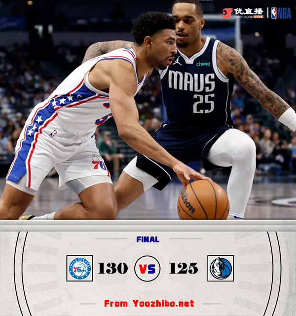 24直播网讯3月17日讯 NBA常规赛激战正酣,独行侠主场迎战76人,两队本赛季均遭遇伤病潮,76人遭遇3连败,22胜44负位列东部第12位,独行侠连败后战绩来到33胜35负,排在西部第10位。此役一上来格莱姆斯联手亚布塞莱不断取分,席菲诺替补登场连中三分,华盛顿连造杀伤单节14分及时止血,首节结束时76人领先4分,次节回来,独行侠众将找到进攻感觉,多点开花的他们一举反超,半场战罢,独行侠后来居上领先4分。易边再战后双方你来我往火热对攻,格莱姆斯延续火力予取予求,三节结束后76人反超确立12分优势,末节上来,丁威迪联手克莱率队追分,决胜时刻丁威迪仓促绝平未果,76人连中罚球后独行侠回天乏术,最终76人130-125力克对手。