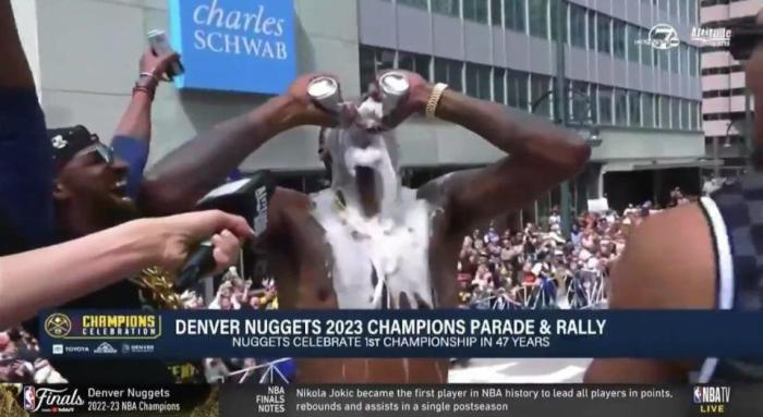 24直播网讯 北京时间6月16日,拿下队史首冠的掘金队,在丹佛举办了盛大的夺冠游行。约基奇带着总冠军奖杯、FMVP奖杯现身,与他的队友一起和球迷们分享夺冠的喜悦。在这次夺冠游行中,亮点不断——