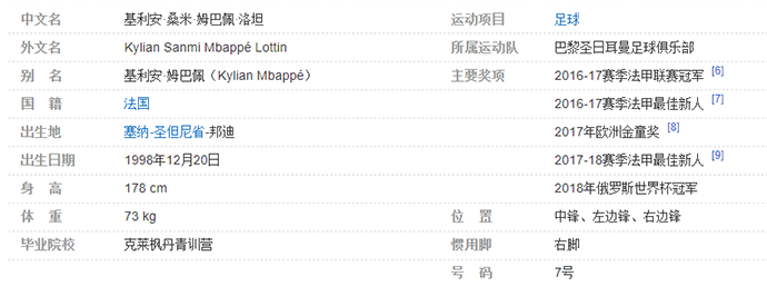 基利安·姆巴佩(Kylian Mbappé),全名基利安·桑米·姆巴佩·洛坦(Kylian Sanmi Mbappé Lottin),1998年12月20日出生于法国塞纳-圣但尼省邦迪,法国职业足球运动员,场上司职前锋,效力于法国足球甲级联赛的巴黎圣日耳曼足球俱乐部。