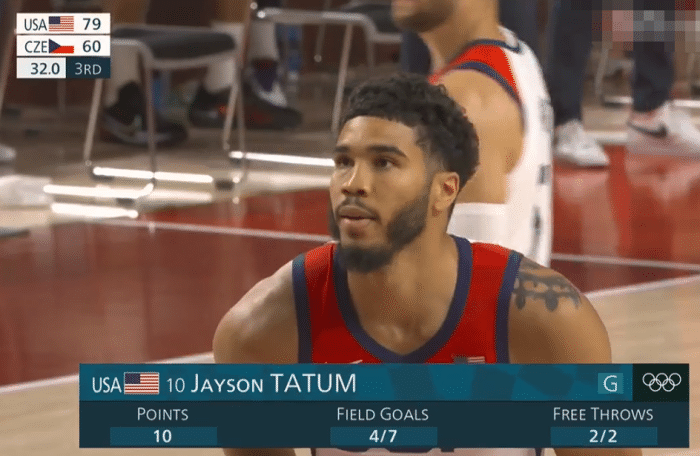 下半场的比赛开始后,杜兰特连续得分,美国队打出了一波小高潮,美国队一度将分差扩大到了11分,关键时刻,格林扑倒维塞利领到违体犯规,维塞利两罚全中,真林基三分命中,捷克队将分差缩小到了7分,布克,格林连续命中三分,杜兰特造犯规两罚全中,塔图姆连续突破上篮得分,一波小高潮之后,分差来到了19分,捷克队有点顶不住美国队的进攻了,杜兰特压哨三分命中,三节比赛打完美国队82:60领先捷克队22分,单节比赛打完美国队轰出了35:17的比分。