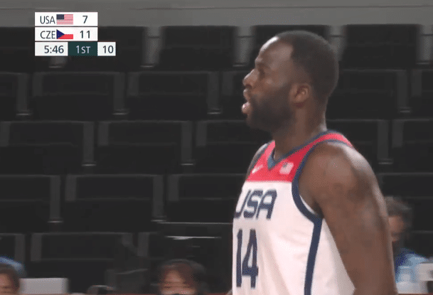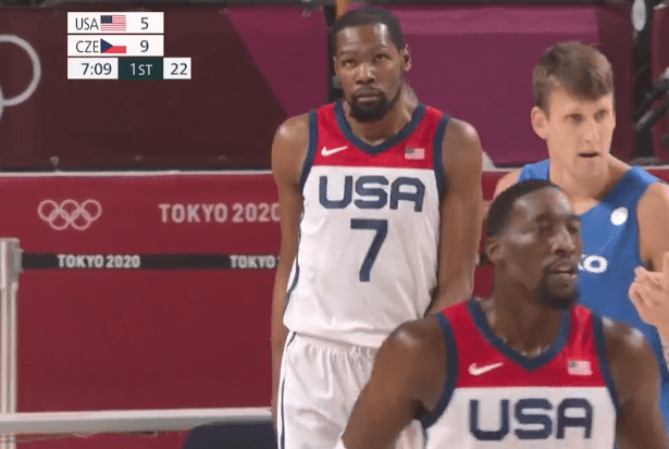 第二节开始,杜兰特三分打铁,塔图姆造犯规两罚全中,捷克进攻遇阻,米德尔顿的两分命中,奥达打进两分,格林的三分命中,萨托兰斯基连续命中,格林再次打进,拉文也是命中,分差只有2分。巴尔文造犯规两罚全中,杜兰特助攻阿德巴约打进,紧接着杜兰特追身三分命中,他的个人奥运会得分超越安东尼,带队反超,里程碑,历史第一人。