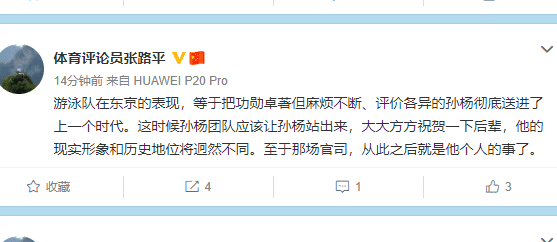 2016里约奥运会上,中国游泳队取得了1金2银3铜,当时队内有孙杨,这次没有孙杨的情况下被看衰,而名嘴张路平表示希望孙杨可以站出来祝贺下这些前队友:游泳队在东京的表现,等于把功勋卓著但麻烦不断、评价各异的孙杨彻底送进了上一个时代。这时候孙杨团队应该让孙杨站出来,大大方方祝贺一下后辈,他的现实形象和历史地位将迥然不同。至于那场官司,从此之后就是他个人的事了。 ”
