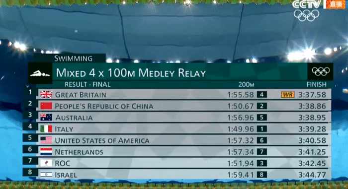 徐嘉余第一棒仰泳,52秒56排名第三、闫子贝第二棒蛙泳缩小和第一名的差距、张雨霏第三棒出战,一度超过意大利升到第一名,后程被反超,杨浚瑄最后一棒,最终中国军团游出3分38秒36,排名第二,夺得银牌。
