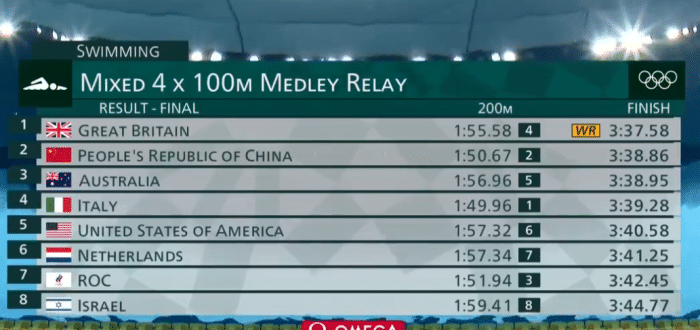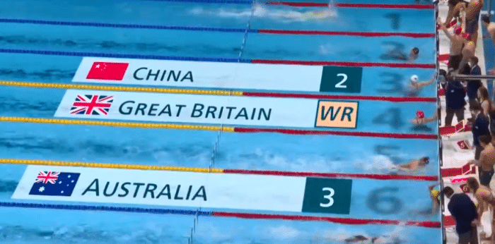 决赛的对决,徐嘉余第一个出场仰泳的比赛,他第一个50米还是紧紧追赶对手,100米结束是排名第三位。第二个出场的是闫子贝,他是蛙泳的比赛,150米的时候,他是升到了第二位,200米交接棒的时候,闫子贝还是第二位。第三个出场的是张雨霏的蝶泳,她是200米蝶泳的冠军,张雨霏超越了意大利队,升至第一位。300米交接的时候,张雨霏第二个交接。最后是自由泳的杨浚瑄,英国队先转身,杨浚瑄努力追赶,后程在冲刺,拿到了银牌,英国队拿到金牌。