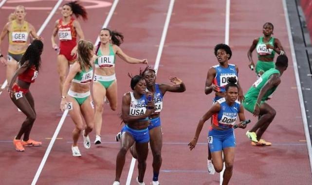 在田径项目4x400米混合接力中,美国田径混合接力队在第1小组出场,作为世界纪录保持者,这本是美国队稳拿的一枚金牌,但由于在接力时站位出现错误,美国队被取消了成绩,从成绩表可以看到,美国队一栏已经显示“DQ”(丧失比赛资格),他们自然也没有资格参加决赛。