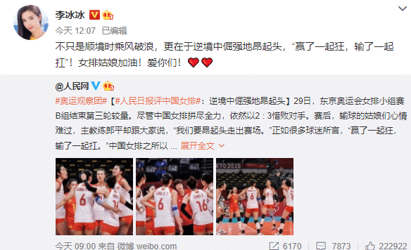 中国女排身处绝境,娱乐圈的李冰冰也在社交媒体上发文力挺:“不只是顺境时乘风破浪,更在于逆境中倔强地昂起头,“赢了一起狂,输了一起扛”!女排姑娘加油!爱你们!”