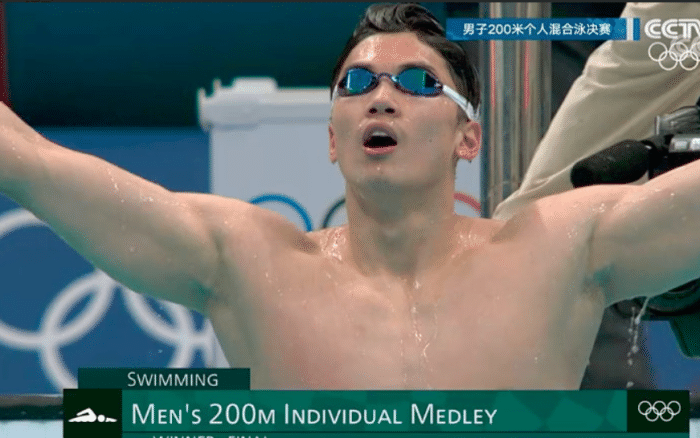 这场比赛,汪顺蝶泳排名第3,仰泳结束汪顺已经追到第一位,而在弱项蛙泳之后,汪顺又跌到了第2位。不过最后的强项自由泳,汪顺全力以赴,最终夺得金牌。而最终1分55秒00的成绩,也打破了亚洲纪录。