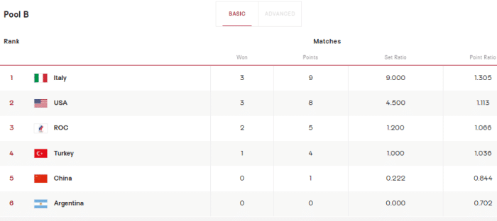 奥运会排名比较的规则按照先后顺序是:1、胜场数;2、净胜局;3、得失分之比;4、两者的胜负关系;