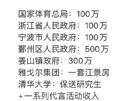 这份名单上的奖励包括1100万人民币,江景房一套,另外清华大学保送研究生以及代言活动。很多网友都表示非常羡慕。