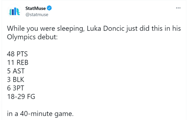 数据网站StatMuse更是多方位呈现了东契奇的48分有多么疯狂。“当你们(美国球迷)在睡觉时,卢卡-东契奇刚刚在奥运首秀上打出了这样的表现:48分11篮板5助攻3盖帽6记三分,投篮29中18,在一场40分钟的比赛里。”