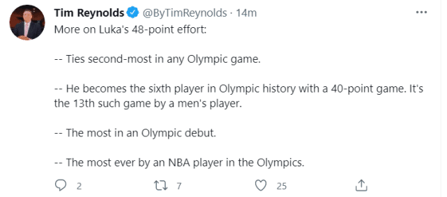 他创造了奥运首秀的球员得分纪录,还创造了NBA球员在奥运会的得分纪录。在奥运会历史上,48分能排在单场得分的第二位,仅次于奥斯卡-施密特的55分。他成为奥运男篮史上第6位能单场轰下至少40分的球员,也是奥运男篮史上第13次出现单场40+的表现。东契奇还是唯一一位在奥运赛场和NBA赛场都砍下至少45分的球员。