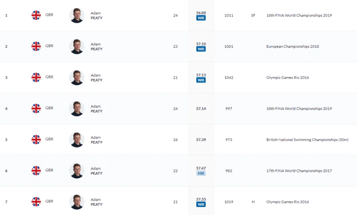 亚当·皮蒂到底有多强?英国蛙王堪称有史以来,蛙泳短距离项目最恐怖的统治者。几项数据足以说明他在这个项目的统治力。