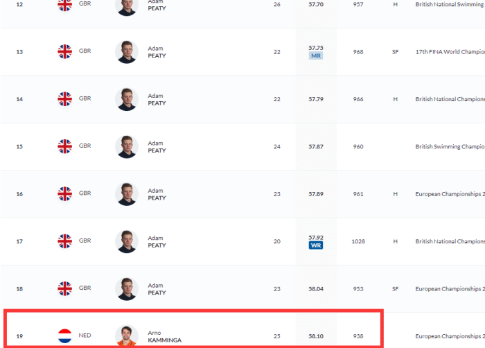第一:皮蒂包揽了男子100米蛙泳历史上最好成绩的前18名,翻开100米蛙泳的历史最好成绩表,放眼望去,全部都是亚当·皮蒂。