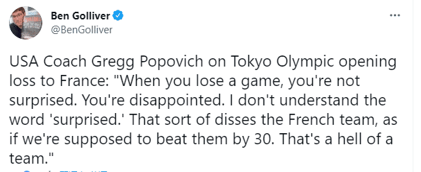 赛后谈到这场失利,美国男篮主帅波波维奇表示:当你输了一场比赛,你不会感到惊讶而会很失望,我不懂“惊讶”这个词的意义,这有点不尊重法国队,好像我们大胜30分似的,那真是一支很棒的球队。