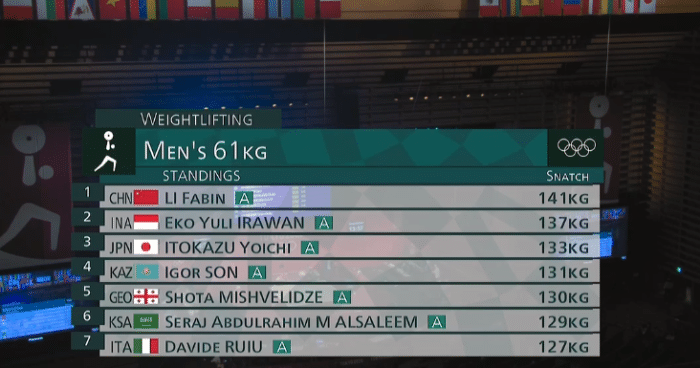 李发彬抓举141公斤排名第一,领先第二名伊拉万4公斤,夺冠形势一片大好;28岁李发彬开把失败,但连续抓举成功,另外李发彬抓举145公斤是世界纪录保持者。