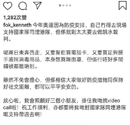 很快霍启刚就在社交媒体上回应,称:“放心拉,我会照顾好三个小朋友,祝工作顺利,把我对国家队和中国香港队的支持带过去啊。”