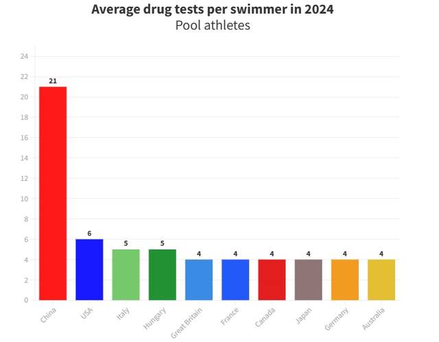 来源:24直播网07-24 10:4724直播网讯 北京时间7月24日,距离东京奥运会开幕已经只剩下最后3天,而中国游泳队在巴黎面对的不公遭遇仍在继续。根据世界泳联的文件显示,兴奋剂药物检测人员重点针对中国运动员,而他们目前正在这样做。代表中国参加本届奥运会的31名游泳运动员平均接受了世界游泳协会和其他反兴奋剂机构(如国际检测机构(ITA))的检测21次,几乎每周一次。如此高频度的检测,很难不对中国运动员产生影响。