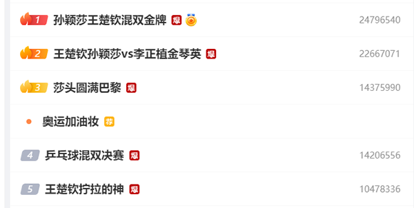 孙颖莎和王楚钦夺得乒乓混双金牌引热议,多个关键词冲上热搜榜——孙颖莎王楚钦混双金牌(热搜榜第一)、王楚钦拧拉的神、莎头圆满巴黎。