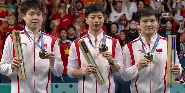 第一场双打,马龙/王楚钦 3-2安东-科尔贝里/克里斯蒂安-卡尔森拿,决胜局马龙制胜一击,原地挥拍握拳庆祝;第二场(单打),樊振东3-2图鲁斯-莫雷加德,拿下后小胖模仿姆巴佩的经典动作;第三场(单打):王楚钦 3-2克里斯蒂安-卡尔森,决胜局11-2拿下,王楚钦仰头怒吼宣泄;国乒男团总比分3-0瑞典队夺得金牌,完成了这个项目的奥运会五连冠。