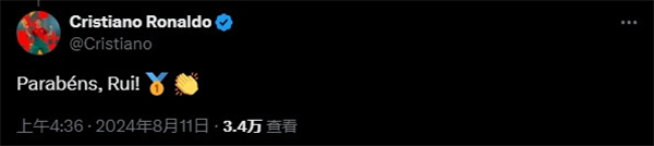 随后C罗第一时间进行回复并且祝贺自己的同胞:“恭喜你,雷陶。你为葡萄牙国民带来巨大荣耀,这是你应得的喝彩!”