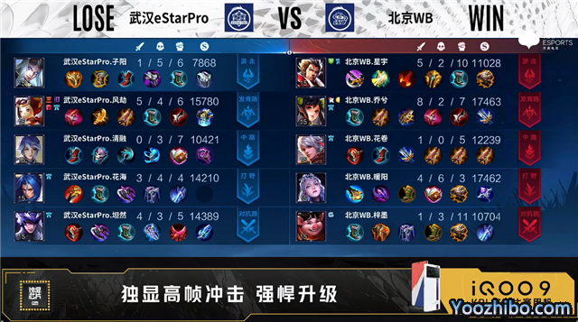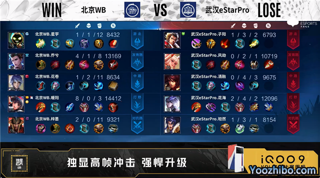 双方常规开局,1分03秒北京WB马可波罗发育路单杀李元芳拿到一血。1分57秒武汉eStar对抗路打出0换2。2分32秒暴君处团战北京WB打出1换2。3分31秒武汉eStar拿下暴君。4分40秒北京WB发育路击杀嬴政。5分17秒武汉eStar拿下主宰。5分53秒对抗路团战北京WB打出0换2。6分44秒主宰处团战北京WB打出0换2。8分05秒野区团战武汉eStar打出1换2。9分11秒武汉eStar主宰处击杀瑶。9分38秒武汉eStar拿下主宰。10分15秒武汉eStar拿下暗影暴君。11分15秒武汉eStar摧毁敌方对抗路二塔。11分50秒野区团战武汉eStar打出1换5。12分28秒武汉eStar摧毁敌方水晶拿下比赛。