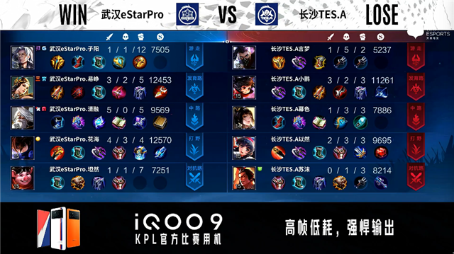 开局武汉eStar边路换线。9分40秒武汉eStar拿下暴君。4分13秒武汉eStar野区击杀周瑜。4分41秒武汉eStar对抗路击杀大乔。5分10秒武汉eStar拿下主宰。6分49秒武汉eStar发育路击杀梦奇。7分03秒武汉eStar拿下暴君。8分17秒对抗路团战武汉eStar打出1换4。8分37秒武汉eStar摧毁敌方中路外塔。9分55秒武汉eStar拿下主宰。10分26秒武汉eStar发育路击杀暃。10分45秒武汉eStar摧毁敌方发育路二塔。12分07秒武汉eStar摧毁敌方对抗路二塔。12分29秒武汉eStar拿下暗影暴君。13分07秒武汉eStar对抗路击杀大乔。13分20秒武汉eStar摧毁敌方水晶拿下比赛。