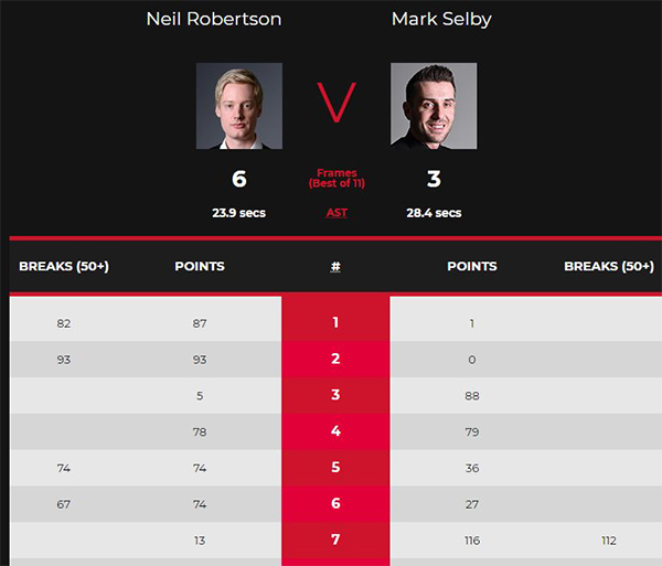 本场比赛前两局,“墨尔本机器”开局就状态火热,一杆86分和一杆93分取得2-0领先。塞尔比在随后两局,以88-5、79-78胜出,双方打成2-2后进入局间休息。第五局,局间休息回来之后,罗伯逊单杆74分制胜,74-36赢下,3-2再次领先。第六局,罗伯逊又打出单杆67分,74-27再胜一局,4-2领先。第七局,塞尔比轰出单杆112分,16-13扳回一局,比分追成3-4。