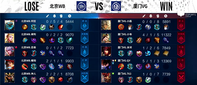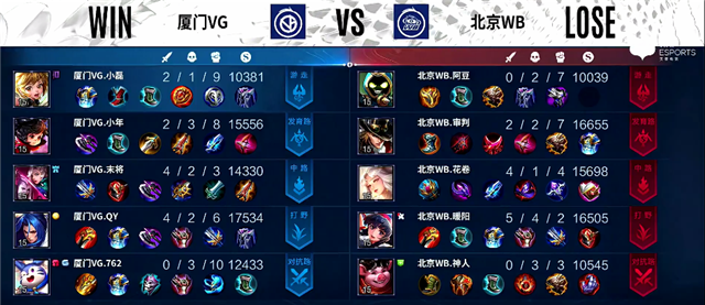 双方和平开局。2分16秒云缨拿下暴君。2分30秒河道团战,关羽拿下一血。3分45秒下路团战,双方1换1。4分钟澜拿下主宰。4分16秒双方互换边路一塔。5分24秒盾山被击杀。5分45秒云缨拿下暴君。8分30秒云缨拿下主宰。9分11秒百里守约推掉中路一塔。9分20秒中路团战,厦门VG打出0换3。12分钟云缨拿下暴君。12分30秒盾山被击杀。14分40秒野区团战,厦门VG团灭北京WB。15分13秒厦门VG推掉水晶率先拿下赛点。