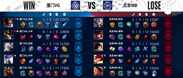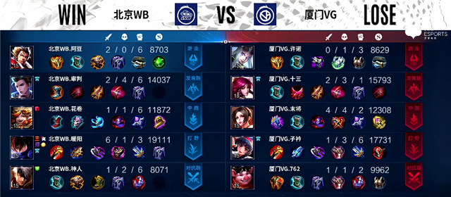 双方和平开局。1分40秒中路团战,镜拿下一血。2分08秒镜拿下暴君,裴擒虎拿下主宰。3分15秒下路团战,镜被击杀,北京WB推掉下路一塔。5分13秒上路团战,北京WB打出0换2。5分30秒中路团战,双方2换2,北京WB推掉中路一塔。6分钟裴擒虎拿下暴君。7分58秒裴擒虎拿下主宰。10分30秒李元芳拿下主宰。11分钟李元芳拿下暴君。11分45秒裴擒虎推掉中路高地塔,团战厦门VG打出1换2。14分10秒高地团战,厦门VG打出1换2。15分钟裴擒虎拿下暴君。15分45秒中路团战,厦门VG打出1换2。18分16秒北京WB中路一塔被破。19分钟中路团战,双方1换1。19分16秒野区团战,厦门VG打出0换2。20分40秒风暴龙王团,关羽被击杀。21分44秒裴擒虎拿下风暴龙王。22分40秒上路团战,厦门VG团灭北京WB。23分47秒马可波罗推掉中路高地塔。25分30秒河道团战,李元芳被击杀。26分40秒镜拿下风暴龙王。28分16秒马可波罗推掉下路高地塔。29分05秒厦门VG推掉水晶追回一分。