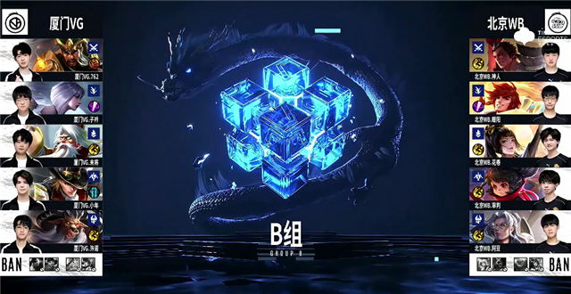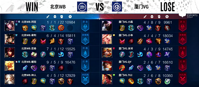 双方平稳开局。1分50秒澜越塔击杀伽罗拿下一血。2分20秒澜拿下暴君,娜可露露拿下主宰。5分钟北京WB推掉中路一塔。6分钟北京WB下路一塔被破。6分40秒澜拿下暴君。6分50秒不知火舞被击杀。7分20秒中路团战,厦门VG打出0换2。8分钟娜可露露拿下主宰。8分50秒中路团战,双方1换1。10分21秒娜可露露拿下主宰。10分36秒狄仁杰推掉中路二塔。10分55秒澜拿下暴君。12分47秒下路团战,狄仁杰被击杀。13分25秒上路团战,厦门VG打出1换2。14分47秒娜可露露拿下主宰。15分钟娜可露露拿下暴君。15分50秒中路团战,伽罗被击杀。19分钟娜可露露拿下主宰。21分40秒风暴龙王团,北京WB团灭厦门VG,澜拿下三杀。22分26秒北京WB推掉水晶率先拿下一分。
