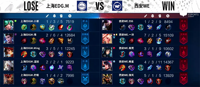 双方和平开局。1分20秒西安WE入侵野区,周瑜拿下一血,团战上海EDG.M打出1换2。2分16秒镜拿下暴君。2分30秒澜拿下主宰。3分50秒中路团战,猪八戒被击杀。4分50秒马可波罗被击杀。6分钟上路团战,西安WE打出1换2。6分30秒狄仁杰推掉下路一塔。7分50秒上海EDG.M推掉上路一塔,狄仁杰被击杀。9分钟野区团战,西安WE打出1换2。9分10秒狄仁杰推掉中路一塔。10分钟澜推掉下路高地塔。10分55秒狄仁杰拿下暴君。12分钟野区团战,西安WE打出1换2。13分钟澜拿下主宰。14分26秒西安WE推掉上路高地塔。15分钟河道团战,双方1换1。15分20秒周瑜拿下暴君。17分35秒澜拿下主宰。19分钟野区团战,西安WE打出0换2。20分钟上海EDG.M中路高地塔被破。21分钟河道团战,西安WE打出1换4。21分37秒西安WE推掉水晶追回一分。