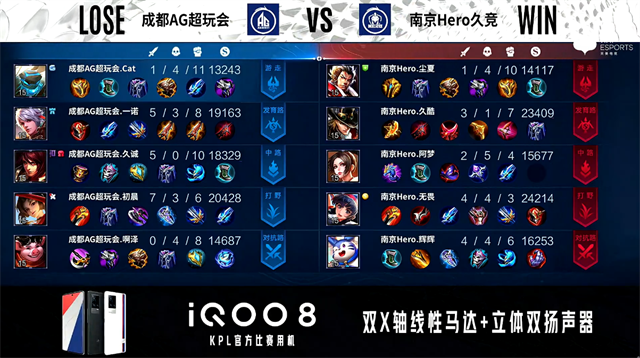 双方常规开局,1分05秒南京Hero拿下中路河道之灵。2分39秒成都AG拿下暴君。2分55秒南京Hero发育路击杀姜子牙拿到一血。3分59秒双方发育路1换1。4分33秒成都AG摧毁敌方发育路外塔。5分20秒双方互换边路外塔。6分03秒南京Hero中路击杀姜子牙。6分26秒成都AG发育路击杀橘右京。6分37秒南京Hero摧毁敌方中路外塔。6分54秒成都AG拿下暴君。8分31秒主宰处团战南京Hero击杀兰陵王。11分25秒发育路团战南京Hero打出1换2。11分50秒野区团战成都AG打出0换3。13分26秒成都AG摧毁敌方中路二塔。14分08秒成都AG拿下暗影主宰。16分30秒成都AG拿下暗影暴君。17分27秒双方发育路1换1。17分59秒成都AG摧毁敌方发育路高地塔。18分56秒成都AG拿下暗影主宰。19分32秒中路团战南京Hero打出1换3。21分34秒中路团战南京Hero打出1换2。23分31秒南京Hero发育路打出0换2。23分39秒成都AG拿下风暴龙王。28分48秒龙王出团战成都AG打出0换5。29分24秒成都AG摧毁敌方水晶拿下比赛。