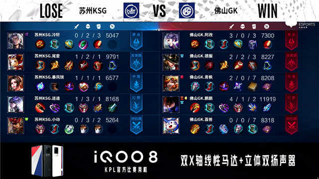 开局佛山GK反掉敌方蓝buff。2分18秒,佛山GK控下暴君。5分11秒,佛山GK狄仁杰下路1v2强行换掉姜子牙。6分20秒,上路团,佛山GK打出1换3。6分55秒,佛山GK破掉苏州KSG上二塔。7分48秒,佛山GK拿下暴君。8分51秒,佛山GK破掉苏州KSG中一塔。9分29秒,佛山GK击杀老夫子,随后破掉苏州KSG下二塔。10分47秒,佛山GK控下暗影暴君,随后秒掉老夫子。11分20秒,佛山GK破掉苏州KSG下高地。11分55秒,佛山GK控下暗影主宰。12分30秒,佛山GK击杀姜子牙,随后破掉苏州KSG中二塔。13分钟,佛山GK镜击杀张飞,随后队伍破掉苏州KSG中高地。13分26秒,佛山GK破掉苏州KSG上高地。13分51秒,双方团战1换1。14分53秒,上路团,佛山GK反打打出2换3。15分46秒,佛山GK剩余三人一波摧毁苏州KSG水晶,3:0赢下比赛!