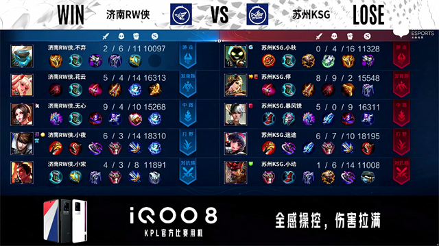 1分57秒,苏州KSG澜击杀姜子牙拿下一血。3分36秒,苏州KSG控下暴君并击杀太乙真人。5分18秒,济南RW侠破掉苏州KSG下一塔并击杀大乔。6分18秒,济南RW侠镜击杀入侵野区的夏侯惇。7分15秒,苏州KSG破掉济南RW侠中一塔。8分45秒,苏州KSG澜拿下暴君,随后团战苏州KSG打出1换2。9分06秒,苏州KSG老夫子大乔破掉济南RW侠上高地。10分25秒,苏州KSG控下暗影暴君。10分47秒,济南RW侠野区击杀苏州KSG两人。11分14秒,济南RW侠控下暗影主宰。12分04秒,济南RW侠五人包下秒掉大乔。12分34秒,下路团,苏州KSG打出0换4,随后破掉济南RW侠下二塔。13分17秒,苏州KSG破掉济南RW侠中二塔。14分59秒,苏州KSG控下暗影暴君。16分46秒,双方团,苏州KSG打出1换3并破掉济南RW侠中高地。17分23秒,苏州KSG团灭对手后破掉济南RW侠水晶拿到赛点。