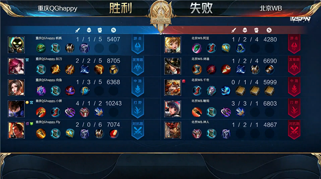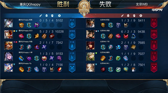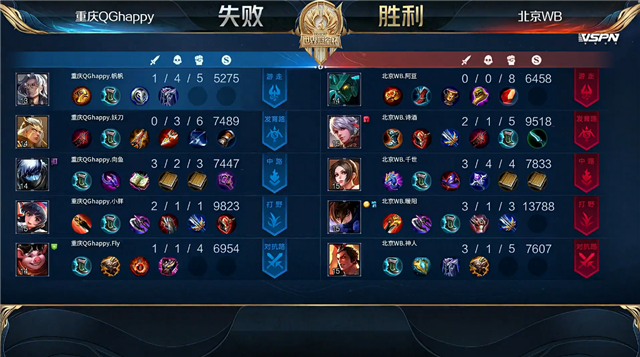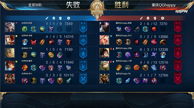 开局北京WB入侵敌方野区,团战重庆QG打出1换3。3分59秒中路下河道团战北京WB击杀戴巧。4分19秒北京WB摧毁敌方下路外塔。4分27秒北京WB拿下暴君。5分09秒双方上路1换1。6分24秒重庆QG拿下主宰。6分55秒双方上路2换2。7分20秒北京WB摧毁敌方中路外塔。8分20秒中路团战北京WB打出0换2。8分52秒北京WB拿下暴君。8分55秒北京WB摧毁敌方中路二塔。9分44秒北京WB摧毁敌方下路二塔。10分28秒北京WB拿下暗影暴君。10分48秒野区团战重庆QG打出0换2。11分07秒重庆QG摧毁敌方中路外塔。11分22秒重庆QG暴君处击杀兰陵王。11分36秒重庆QG拿下暗影主宰。12分42秒北京WB中路击杀马可波罗。13分04秒北京WB打出2换4。15分06秒中路团战重庆QG打出2换3。16分02秒野区团战重庆QG打出1换2。16分46秒重庆QG拿下暗影暴君。17分58秒重庆QG拿下暗影主宰。19分39秒重庆QG中路击杀兰陵王。20分33秒野区团战重庆QG打出1换3。21分17秒重庆QG摧毁敌方下路高地塔。21分40秒重庆QG拿下风暴龙王。22分45秒重庆QG摧毁敌方中、上高地塔。23分整高地团战重庆QG打出0换4。23分15秒重庆QG摧毁敌方水晶拿下比赛。