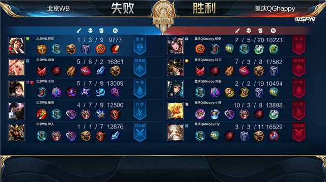 双方常规开局。1分58秒上路双方1换1,北京WB拿到一血。2分32秒重庆QG下路击杀鲁班七号。3分14秒主宰处团战重庆QG打出0换3,上官婉儿拿到三连决胜。3分49秒野区团战北京WB击杀公孙离。4分35秒双方野区1换1,重庆QG摧毁敌方中路外塔。4分54秒双方野区1换1。5分54秒下路团战重庆QG打出0换4。6分18秒重庆QG摧毁敌方下路二塔。6分25秒重庆QG摧毁敌方中路二塔。7分01秒重庆QG上路击杀云缨。7分41秒重庆QG拿下主宰。10分16秒重庆QG拿下暗影暴君。10分58秒高地团战北京WB打出1换2。重庆QG摧毁敌方上路高地塔。11分55秒重庆QG拿下暗影主宰。13分21秒中路团战北京WB打出2换3。14分42秒重庆QG拿下暗影暴君。15分57秒重庆QG摧毁敌方下路高地塔。16分28秒北京WB野区击杀兰陵王。17分01秒北京WB摧毁敌方中路外塔。19分05秒野区团战重庆QG打出1换4。19分35秒重庆QG摧毁敌方水晶拿下比赛。