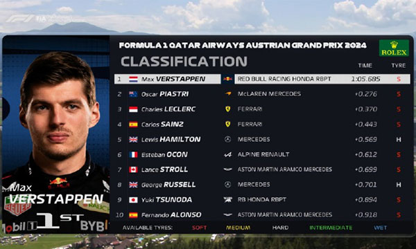 24直播网讯 北京时间06月28日晚,2024F1奥地利大奖赛, 一练最终成绩: