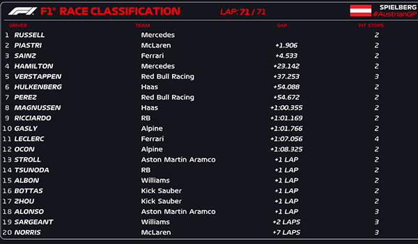 24直播网讯 北京时间06月30日,F1奥地利站正赛结束,拉塞尔捡漏夺冠!维斯塔潘诺里斯相撞双双痛失冠军,周冠宇第17。
