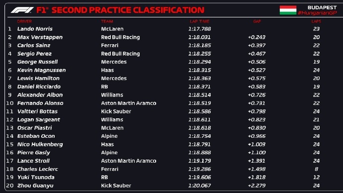 - 【录像】[腾讯]2024F1匈牙利大奖赛第二次练习赛 圈速2024-07-20 11:01:41