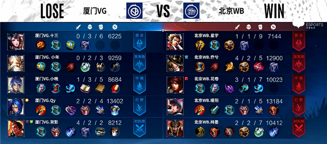 2分10秒下路团战,虞姬拿下一血。3分钟下路团战,虞姬被击杀。4分30秒刘邦被击杀。5分钟镜拿下暴君。5分18秒虞姬推掉下路一塔。5分30秒西施被击杀。6分钟虞姬被击杀。6分钟上路团战,双方1换1。7分钟镜推掉中路一塔,关羽被击杀。8分钟镜拿下主宰。9分钟下路团战,北京WB打出1换4。9分40秒镜拿下暴君。11分钟中路团战,双方2换2,澜拿下主宰。13分钟镜拿下暴君。14分钟镜拿下主宰,澜拿下暴君。15分20秒中路团战,北京WB1换4团灭厦门VG。15分52秒北京WB推掉水晶拿下本场比赛胜利。