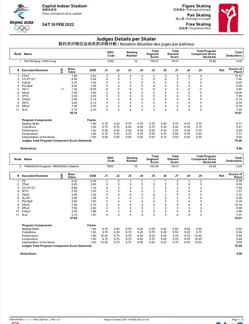 被质疑的点是在跳跃的3S,当时韩聪没有问题,隋文静双脚落冰,没有摔倒。但其实翻看赛后的裁判打分就可以看出,这个动作确实给隋文静和韩聪打了很低的分数,双足落冰给予了最严厉的goe-5的处罚,相当于摔倒的处罚,这几乎是重罚,毕竟裁判只给了0.65分。