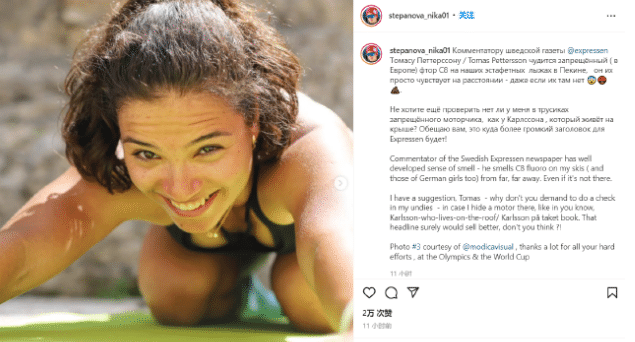 面对瑞典记者毫无根据地猜测,身为战斗民族的斯捷潘诺娃自然不会忍气吞声,任由他人诋毁自己和队友的荣誉。于是,她在社交媒体上直接怒怼,称瑞典《快报》记者的嗅觉竟然发达到可以隔着很远,也能够闻到滑雪板上C8润滑剂的味道。