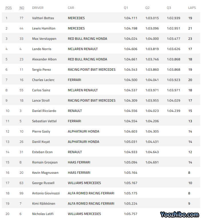 最后两分钟,车手们重新回到赛道,杆位竞争集中在博塔斯和汉密尔顿两位梅赛德斯车手身上,博塔斯最后一个单圈冲出了赛道,引发了黄旗,汉密尔顿提升了自己的成绩,但是依然落后队友博塔斯0.012秒。最终博塔斯拿下了本站比赛的杆位,接下来依次是汉密尔顿、维斯塔潘、诺里斯和阿尔本。